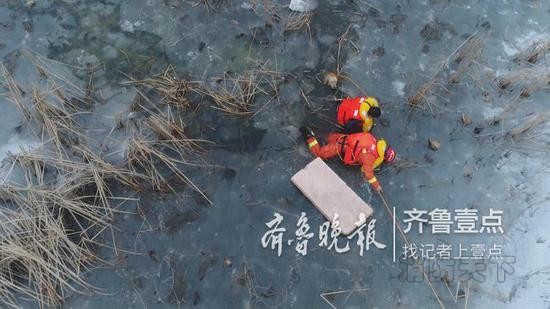 據昌邑消防大隊消防員魏壽文介紹:得知被困人員位置后,他們攜帶漂浮繩和救生衣,前往孤島進行救援。在救援過程中,由于冰面厚度不足以支撐人的重量,消防員淌水前往島上。